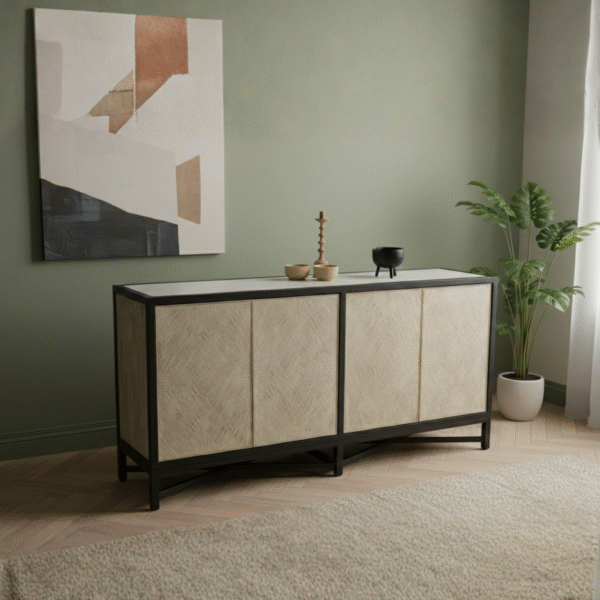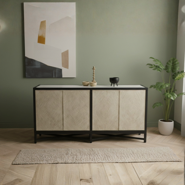 Modern minimalist sideboard made from solid teak wood and natural rattan. Handmade in Indonesia with export quality, perfect for stylish storage in residential and commercial interiors.
